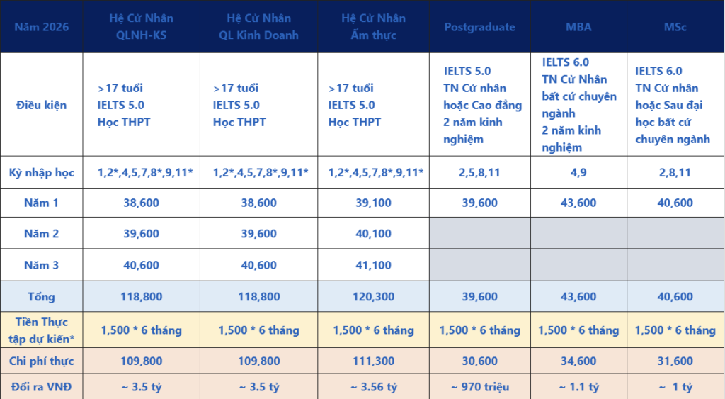 Từ năm 2026, Business & Hotel Management School (BHMS) – học viện hàng đầu của Thụy Sĩ trong lĩnh vực Hospitality, Kinh doanh và Nghệ thuật Ẩm thực – chính thức mở rộng danh mục đào tạo với nhiều chương trình Cử nhân, Thạc sĩ và Dự bị Thạc sĩ mới. Song song với đó, sinh viên quốc tế có cơ hội nhận học bổng hấp dẫn lên đến CHF 8,000 trong năm đầu tiên.