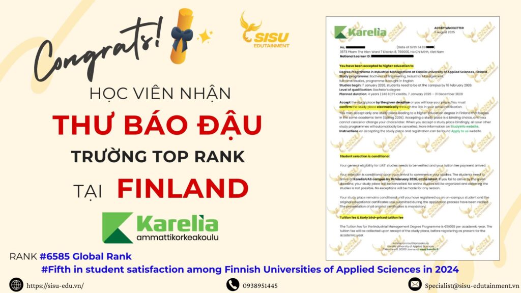SISU xin gửi lời chúc mừng nồng nhiệt đến Hồ Thanh Xuân – bạn đã chính thức giành được tấm vé vào chương trình Bachelor of Industrial Management tại Karelia University of Applied Sciences, Phần Lan. Đây là thành quả đáng tự hào sau quá trình kiên trì học tập và chuẩn bị hồ sơ kỹ lưỡng.