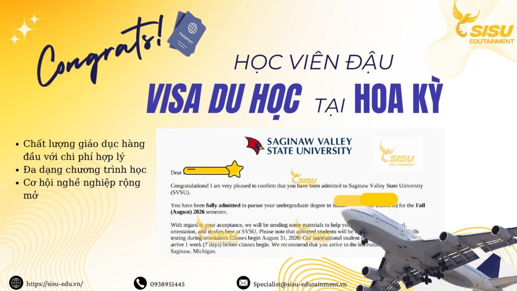 SISU xin gửi lời chúc mừng nồng nhiệt đến Hoàng Khánh Linh – học viên đã xuất sắc chinh phục học bổng Red and White từ Saginaw Valley State University (SVSU) cho kỳ học mùa Thu tháng 8/2026.
