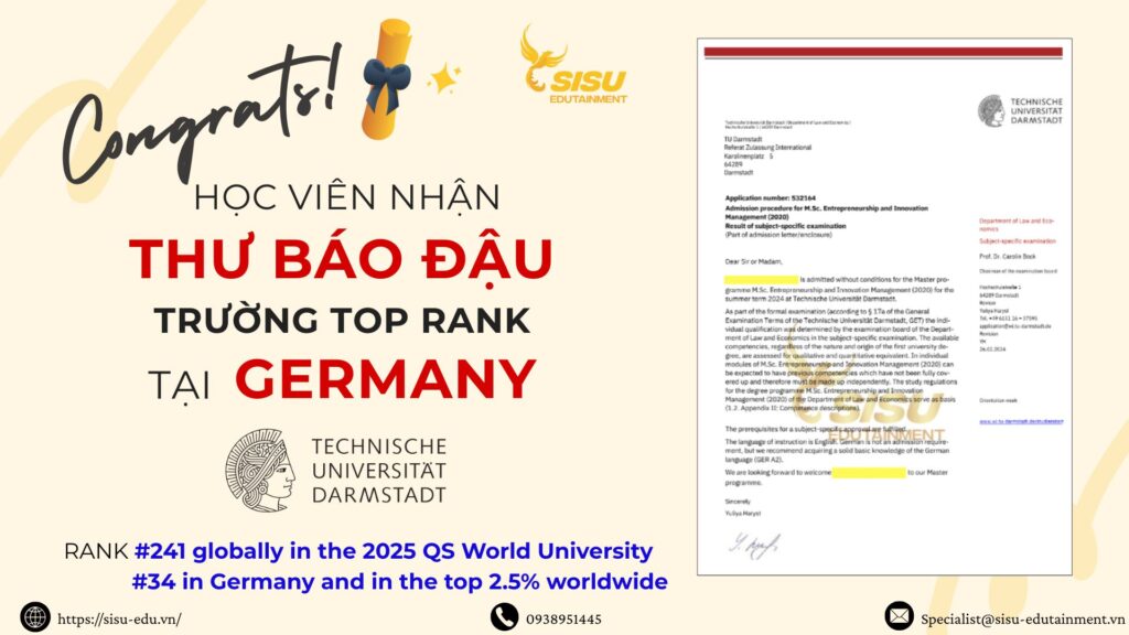👉 Nếu bạn cũng mong muốn học tập tại những trường đại học danh tiếng châu Âu như TU Darmstadt, hãy để SISU EDUTAINMENT đồng hành cùng bạn từ bước chuẩn bị hồ sơ, APS, luyện tiếng Anh/Đức cho đến chiến lược học bổng.