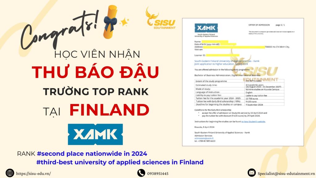 SISU xin gửi lời chúc mừng nồng nhiệt đến Phan Trần Ánh Ngọc – học viên đã xuất sắc vượt qua kỳ thi đầu vào đầy cạnh tranh và chính thức giành được suất học tại XAMK University of Applied Sciences (Phần Lan).
