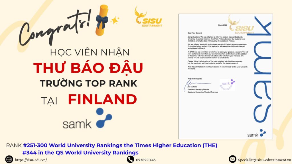 SISU xin gửi lời chúc mừng nồng nhiệt đến Phạm Trần Yến Nhi – học viên đã xuất sắc chinh phục thành công kỳ tuyển sinh đầy cạnh tranh tại Satakunta University of Applied Sciences (SAMK).