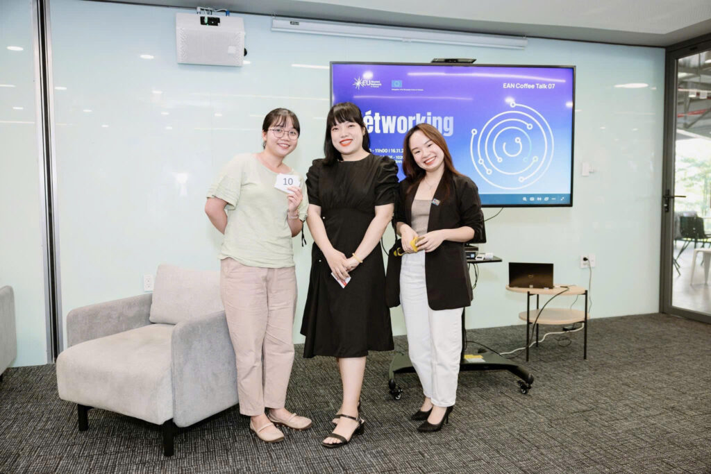 Trong bức ảnh ghi lại khoảnh khắc tại chương trình, cô Thư xuất hiện cùng hai khách mời trong một không gian hiện đại, với màn hình sự kiện EAN Coffee Talk 07 – Networking làm nền phía sau.