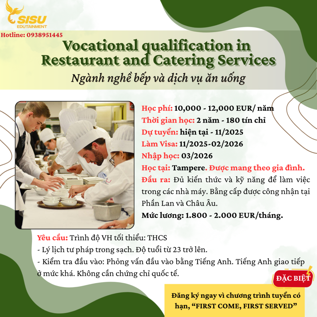 SISU Edutainment hân hạnh giới thiệu chương trình du học nghề ngành Đầu bếp & Dịch vụ ăn uống tại Phần Lan, thời gian học 2 năm, cấp bằng nghề chính thức của châu Âu — mở ra cơ hội làm việc lâu dài tại môi trường quốc tế.