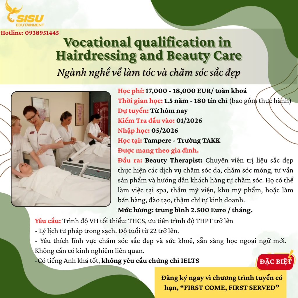 Ngành công nghiệp làm đẹp không bao giờ hạ nhiệt. Với tấm bằng Vocational Qualification in Hairdressing and Beauty Care từ Phần Lan, bạn không chỉ sở hữu kỹ năng tay nghề đạt chuẩn quốc tế mà còn mở ra cánh cửa trở thành một Beauty Therapist chuyên nghiệp tại thị trường châu Âu.