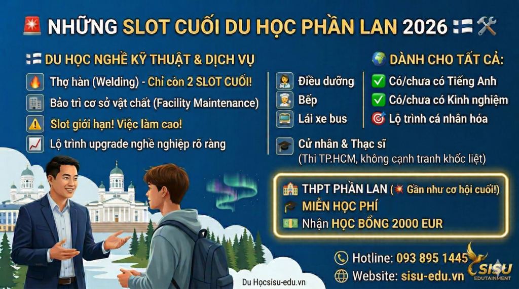Bạn đang tìm kiếm một lộ trình sự nghiệp ổn định tại Châu Âu với mức chi phí thấp nhất? Phần Lan – quốc gia hạnh phúc nhất thế giới – đang mở cửa đón nhận nhân lực cho các khối ngành kỹ thuật và dịch vụ. Tuy nhiên, thời gian không còn nhiều khi các suất tham gia đang dần lấp đầy. Đây chính là thời điểm vàng để bạn chốt ngay lộ trình cá nhân hóa, bắt đầu cuộc sống mới tại xứ sở nghìn hồ.
